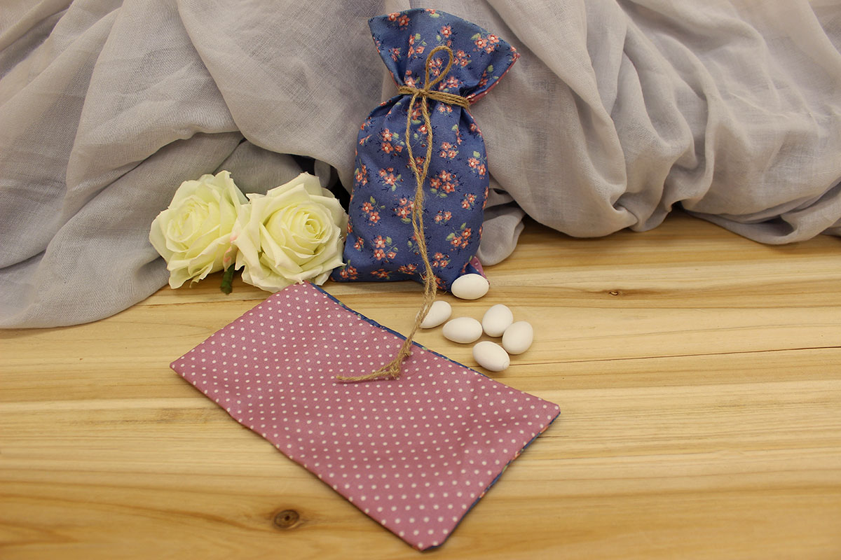 Υφασμάτινο πουγκί με 2 όψεις απο ύφασμα ρομαντικό μπλε και πουά σάπιο μήλο.