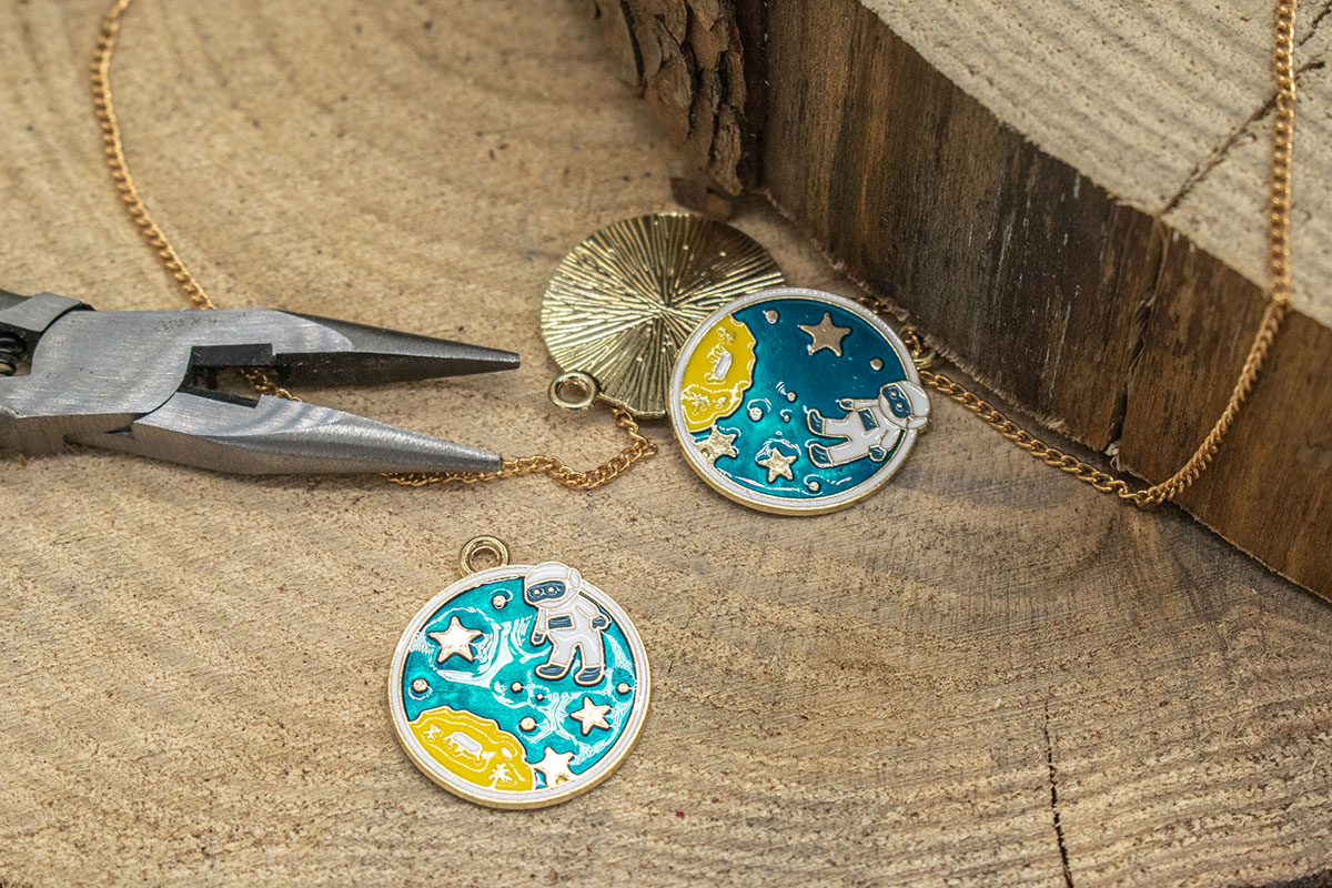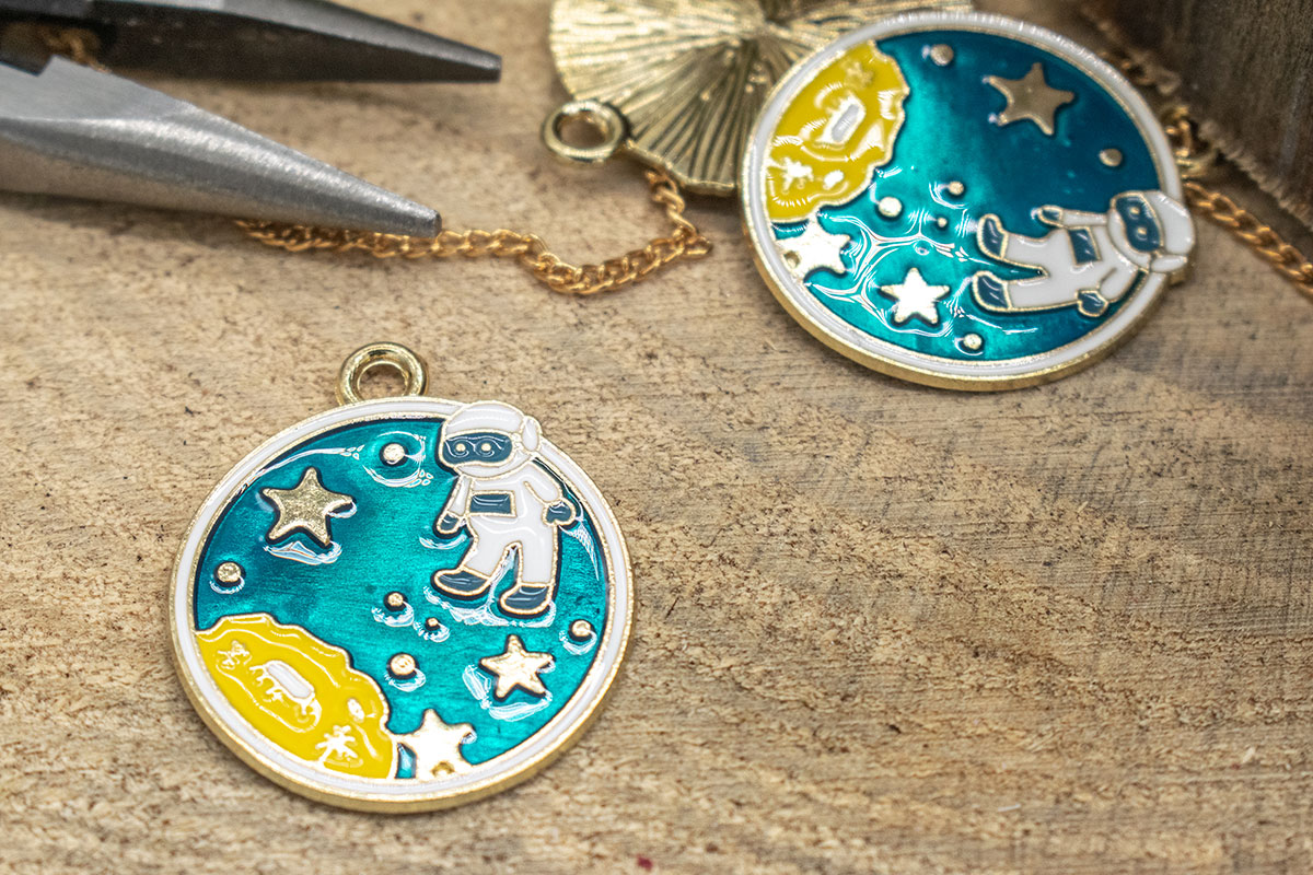 Μεταλλικό μενταγιόν χρυσό με σχέδιο αστροναύτη στο διάστημα και λεπτομέρειες από χρωματιστό σμάλτο. Συνδυάστε τα μεταλλικά στοιχεία με κορδόνια, κορδέλες, δαντέλες και