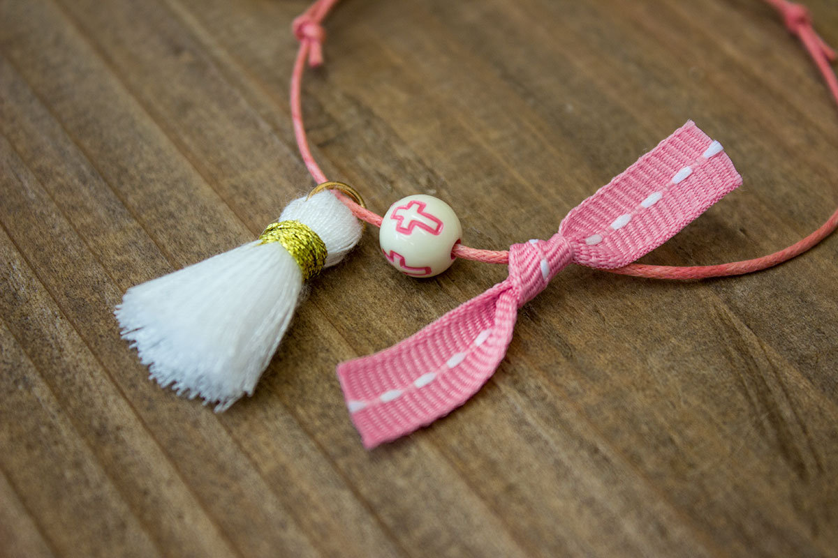 Χειροποίητα μαρτυρικά βραχιολάκια με λευκή φουντίτσα, ροζ φιογκάκι και χάντρα με διακριτικό σταυρουδάκι στο ίδιο χρώμα, σε έναν αρμονικό συνδυασμό με κοραλί κορδόνι.