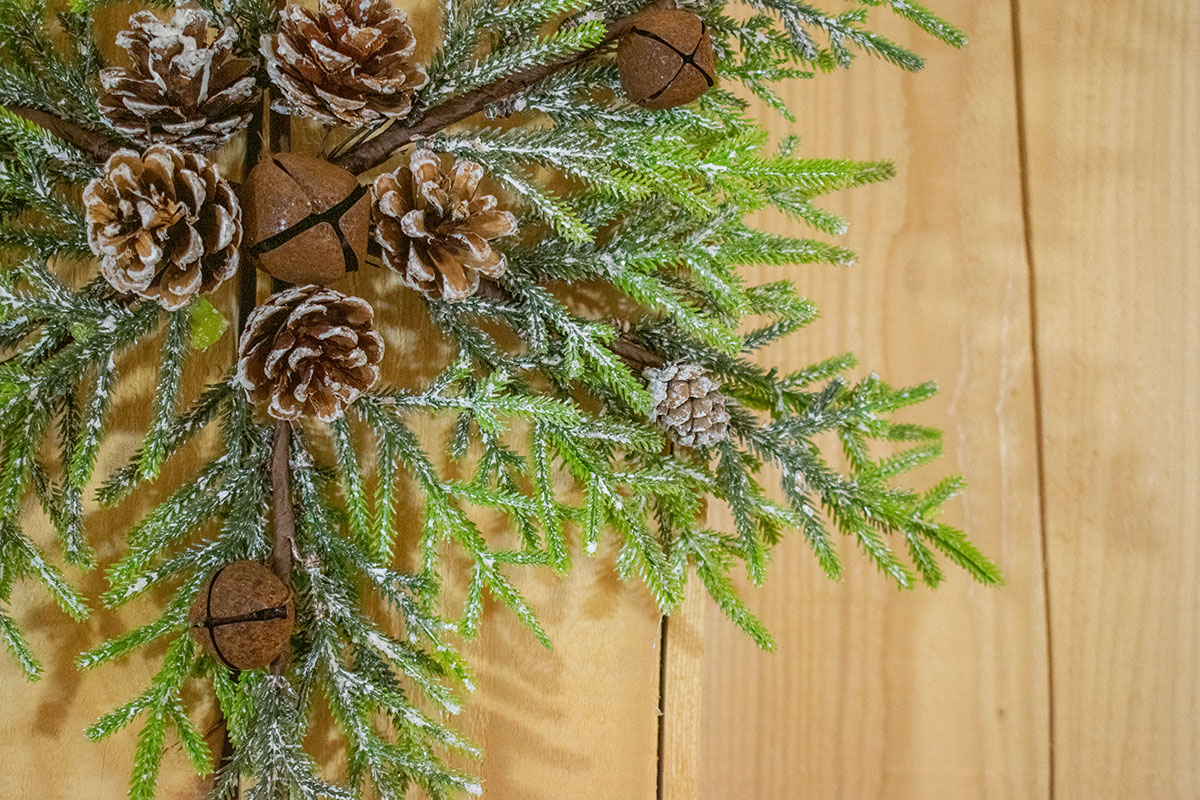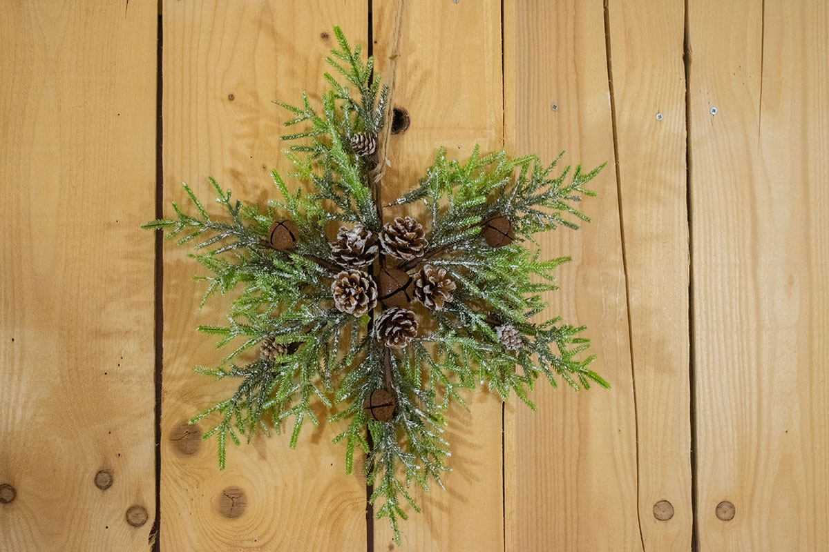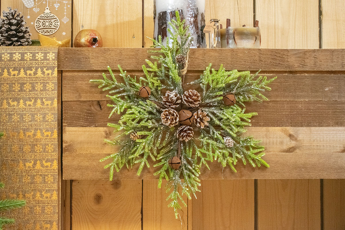 Χριστουγεννιάτικο κλαδί σε σχήμα νιφάδας με κουκουνάρια και κουδουνάκια rust.